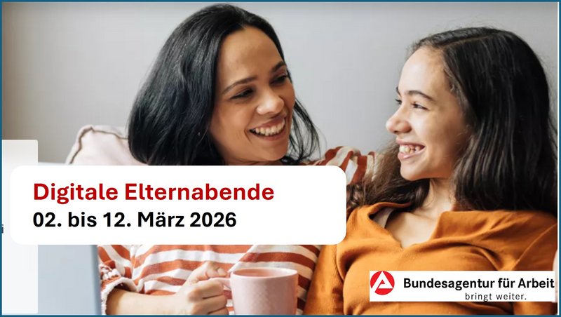 💡 Vom 02.-12. März 2026 veranstaltet die Bundesagentut für Arbeit die digitalen Elternabende. Hier haben Sie als Eltern und Ihre Kinder die Möglichkeit, branchenübergreifenden Unternehmen direkt Fragen rund um Ausbildungs- und duale Studienmöglichkeiten zu stellen.